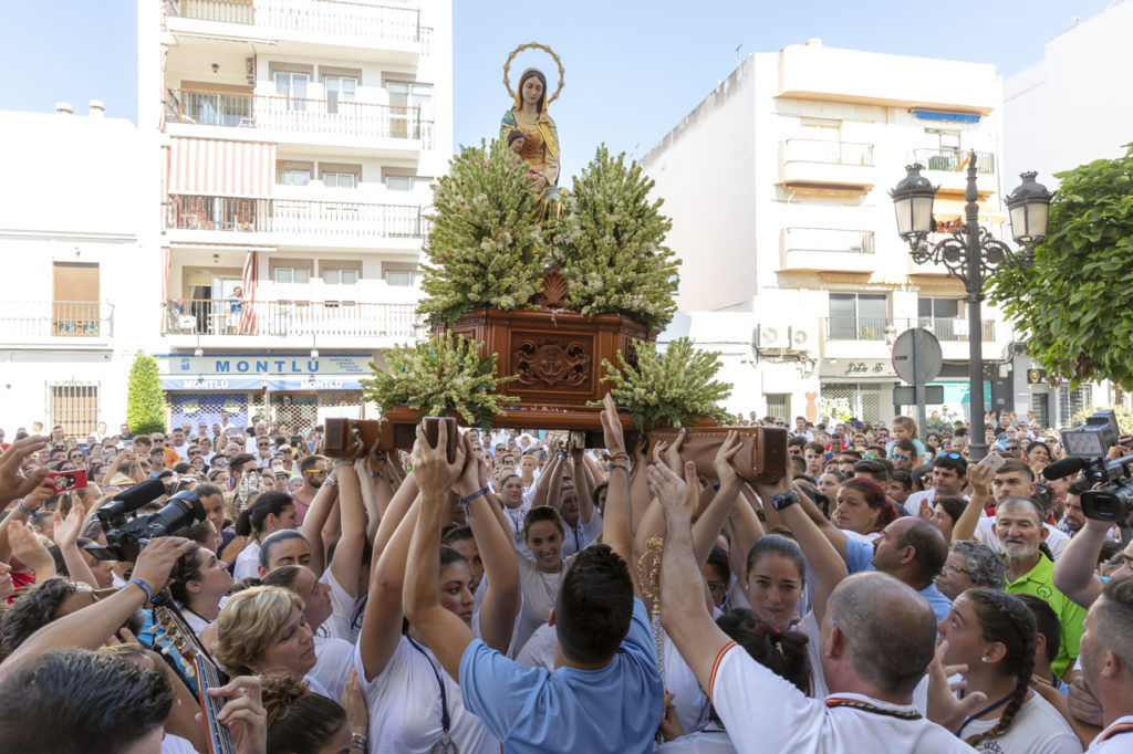 Casi sin tiempo para almorzar, fieles, vecinos, curiosos y turistas esperaron hasta las cuatro de la tarde a las puertas de la iglesia, a pesar del intenso calor, para ver la salida procesional de la Virgen del Mar portada por mujeres costaleras de la barriada y que, tras recorrer las avenidas principales, llegaron hasta el puerto pesquero donde embarcó en la embarcación «Puerto Deseado» para bendecir las aguas.