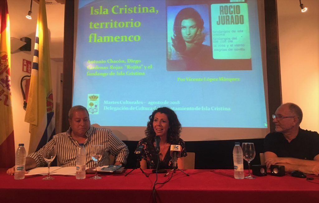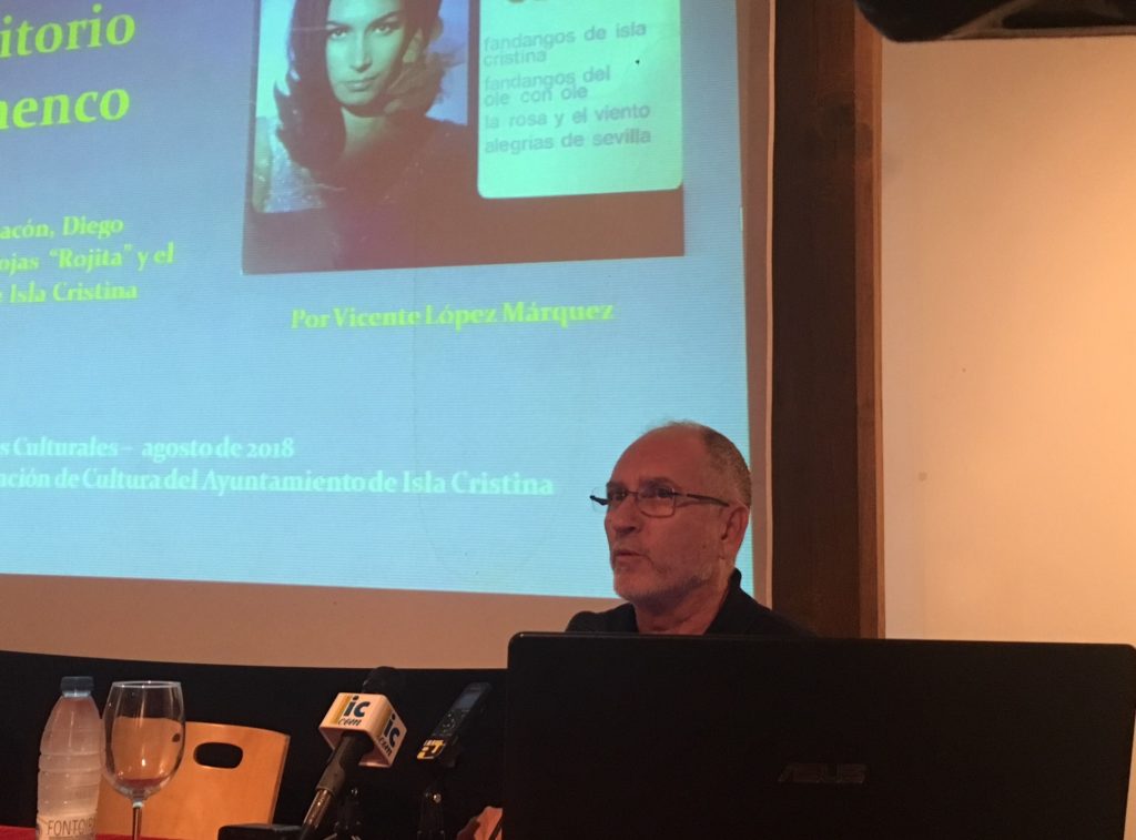 Una vez hechas las presentaciones, Vicente López Márquez ponía sobre la mesa un minucioso estudio en el que detallaba la relación del Flamenco y el Cante Hondo con Isla Cristina a través de las figuras de Antonio Chacón y el isleño Diego Cárdenas Rojas ‘Rojita’ y en la que trató también el tema del Fandango de Isla Cristina.