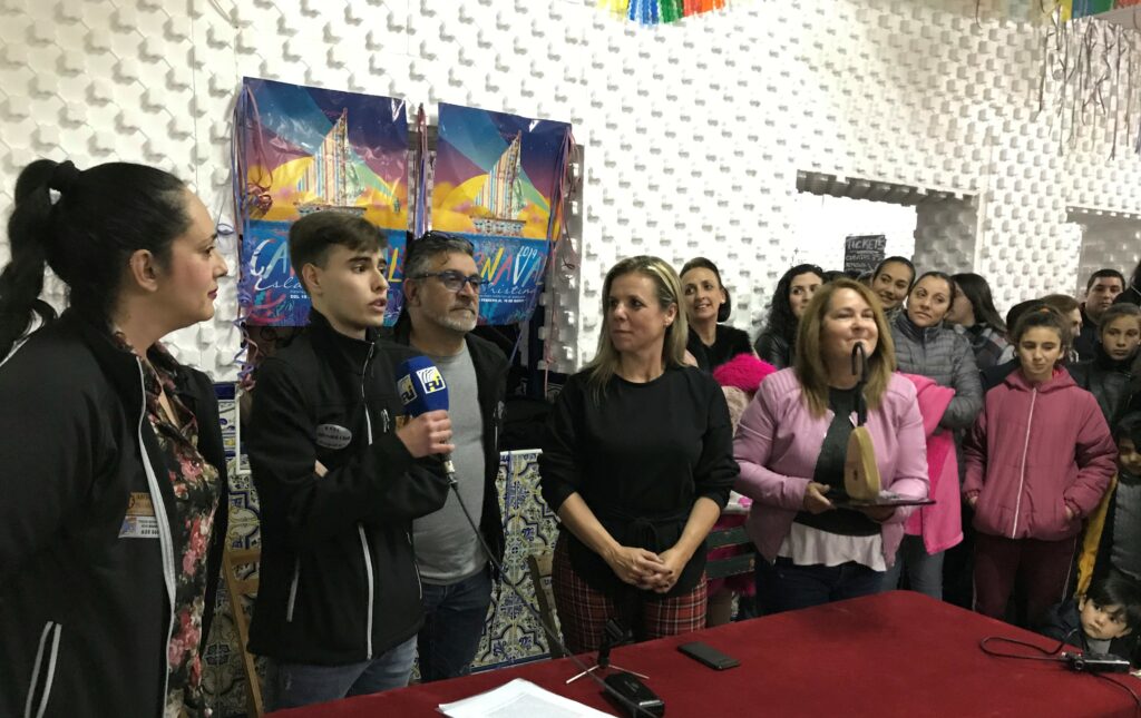 También se entregó en la noche del viernes y sin moverse de la misma sede, el galardón “Espacial de Oro” que otorga la Peña “Los Espaciales”, una de las más activas durante todo el año y que en carnaval intensifican, entre otros con la entrega de su máximo premio y que en esta ocasión se llevó alguien “de la casa”, la incansable carnavalera María de los Ángeles Rodríguez Macías.