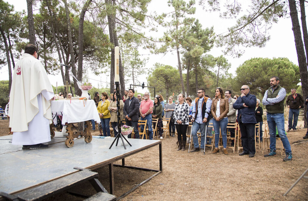 Tras dos días acampados en el recinto romero de «Altos de Don Gaspar», pasado el mediodía del domingo párroco titular de la parroquia en Pozo del Camino, Karol Adam Zuraw, oficiaba una Misa Romera, cantada por el «Coro de mayores Santísima María de la Bella de Lepe».