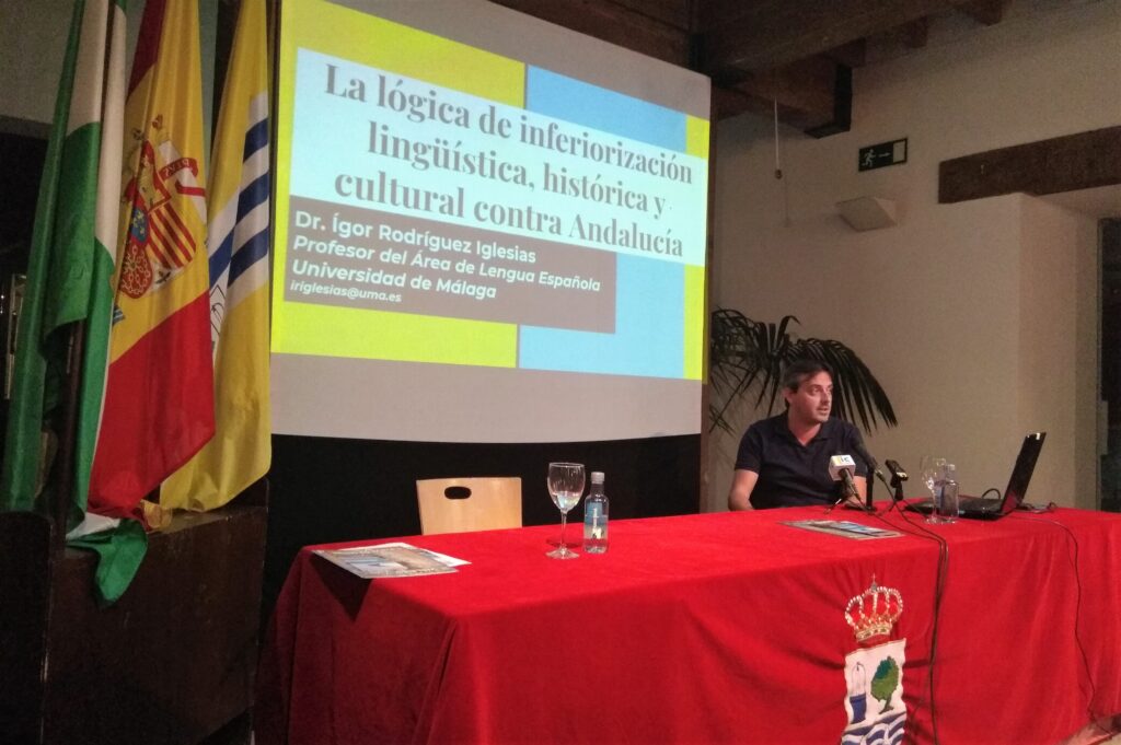 Isla Cristina, 10 de julio de 2019.- Los ciclos de los Martes Culturales acogieron este martes una conferencia de Ígor Rodríguez Iglesias bajo el título ‘Inferiorización lingüística, histórica y cultural contra Andalucía’, en la que ha realizado un análisis sobre las causas que llevan a este fenómeno y las consecuencias que tiene.
