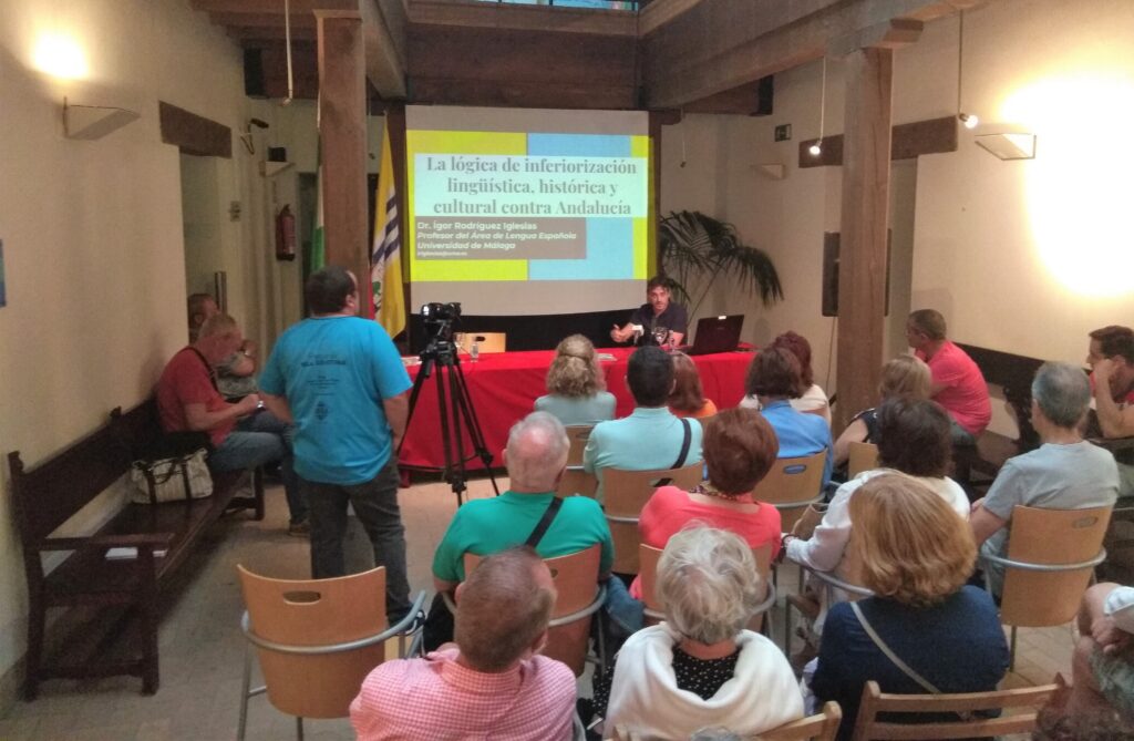 A través de conversaciones y entrevistas realizadas a diferentes personas durante el trabajo de campo para la elaboración de su tesis, el ponente trasladó al público ejemplos reales de personas que han sufrido una discriminación, en la mayoría de los casos de carácter laboral, por tener un acento andaluz. Con este argumento continuó el resto de la intervención, explicando las diferentes consecuencias que surgen de la ‘inferiorización’ de Andalucía.
