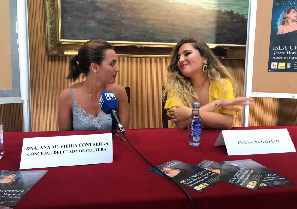 Isla Cristina, a 1 de agosto de 2019.- La cantante gaditana, Laura Gallego, ha presentado el concierto que ofrecerá el próximo 14 de agosto en el Teatro Municipal ‘Horacio Noguera’ de Isla Cristina, en la que sería su cuarta actuación en la localidad desde el comienzo de su carrera. En el acto, la artista estuvo arropada por su club de fans y acompañada por la Concejala de Cultura del Consistorio isleño, Ana Vieira.