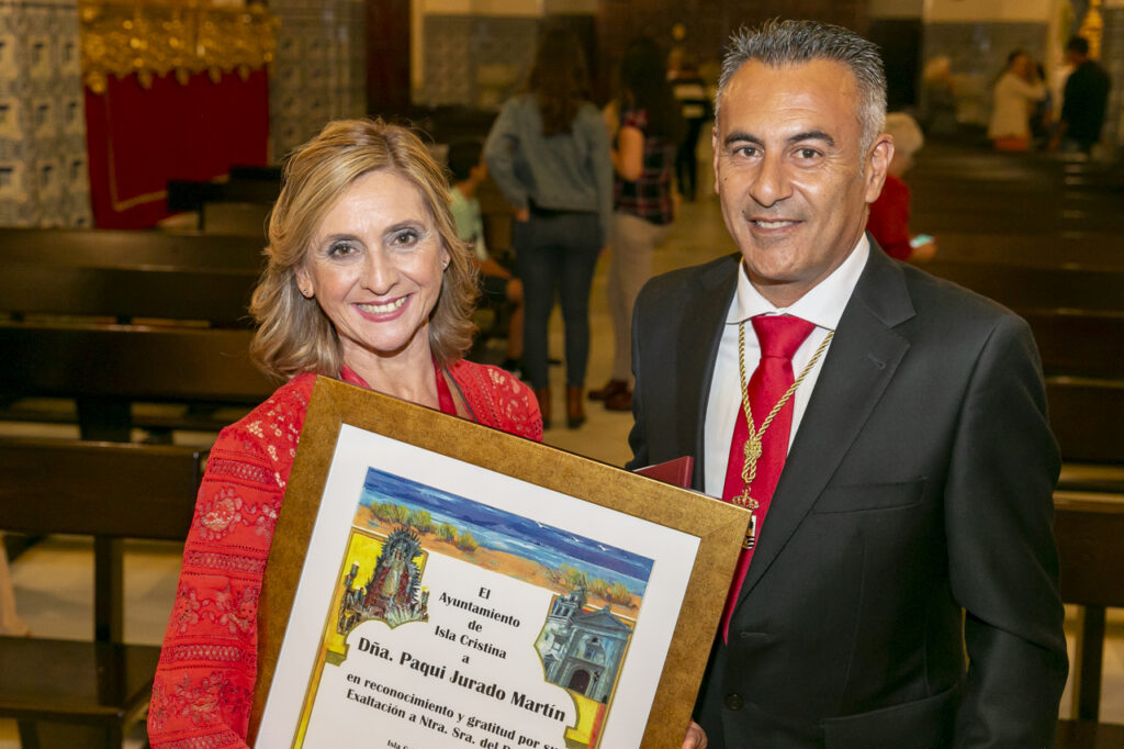 Por su parte, Francisca Jurado Martín, tras los saludos y agradecimientos, sobre todo a la misma Virgen del Rosario “por tu llamada” para la exaltación. A partir de aquí, vivencias y sentimientos personales plasmados en unos folios que emocionó a una iglesia abarrotada de un público, devotos y fieles a la Patrona y Alcaldesa Perpetua de Isla Cristina.