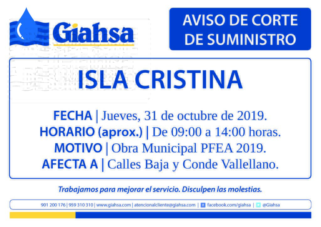 Por indicación del departamento de Obras de Giahsa, les comunicamos que se va a ejecutar un corte de suministro en ISLA CRISTINA el jueves 31 de octubre con arreglo a los siguientes datos: