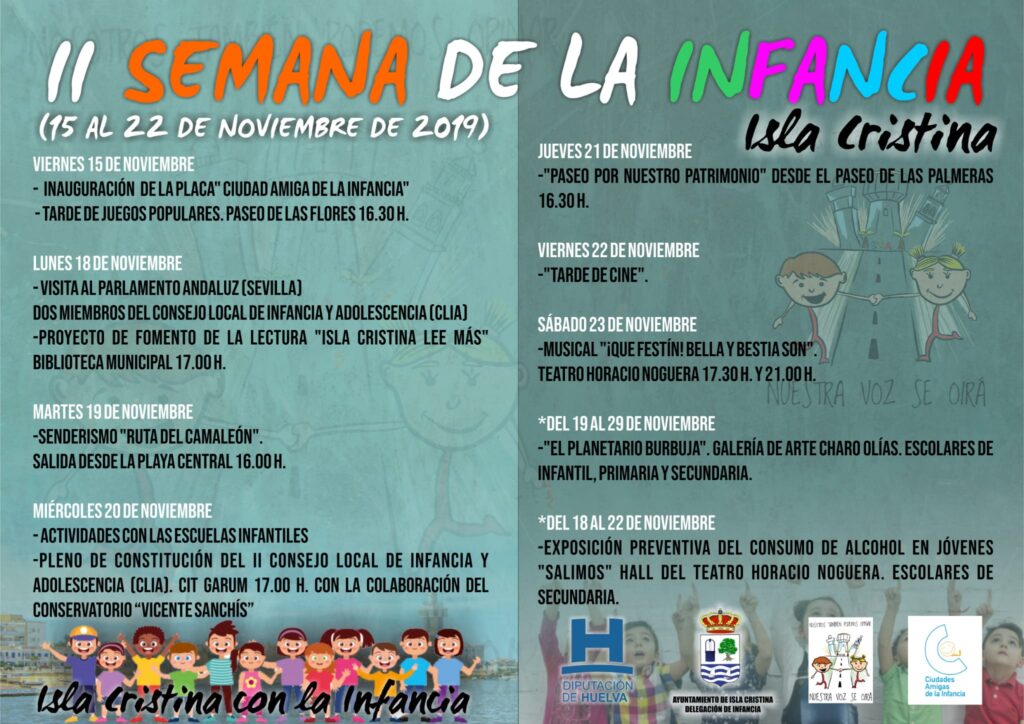 Isla Cristina 13 de noviembre de 2019.- Esta mañana, en la sede de los Servicios Sociales Comunitarios, se daba a conocer la programación que conforma la II Semana dedicada a la Infancia que, organizada por el Ayuntamiento, a través de la Delegación de Políticas Sociales (área de Infancia), se celebrará del 15 al 22 del mes en curso en el marco del Día Mundial de la Infancia, el próximo 20 de Noviembre en el que se conmemoran los Derechos del Niño y de la Niña.