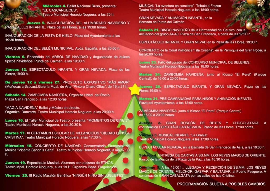 Antes de entrar a desgranar el programa, el Primer Teniente de Alcalde especificó que el programa se desarrolla bajo el epígrafe ‘Isla Cristina” en Navidad’ destacando que, “ya estamos en ambiente pre-navideño, y aunque algunos municipios han encendido ya su alumbrado, nosotros arrancaremos mañana” añadiendo “que Islantilla ya presentaba su campaña y no descartamos exportar algunas ideas para el próximo año, como el Concurso de Muñecos de Nieves Tumbados a Sol porque es una iniciativa que tiene mucho éxito, o poder celebrar la Navidad en el Ayuntamiento reformado y restaurado ya” para finalizar invitando a toda la ciudadanía a los actos y actividades que hemos programado, y que sobre todo, que vivamos la Navidad en Isla Cristina, que dejemos aquí nuestro dinero, comprando en nuestro comercios, y disfrutemos todos y todas de una Navidad que empieza ya con el alumbrado y culmina con nuestra Cabalgata de Reyes” felicitando a todos, en nombre de su grupo, la Navidad.” Para finalizar, el Primer Teniente de Alcalde puntualizó que “la programación navideña es una programación trasversal, en la que participan la mayoría de las Delegaciones Municipales a los que se unen colectivos, e entidades y asociaciones, sumando y aportando a todo el conjunto.”