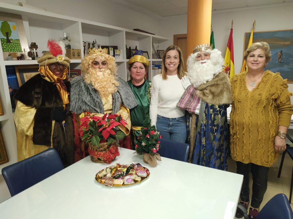 Mientras, los Emisarios de Sus Majestades, siguen recorriendo la localidad y tras visitar varias sedes de asociaciones, llegaron hasta el Ayuntamiento de Isla Cristina, donde fue recibidos por la Teniente de Alcalde, Laura López Pichardo y la Presidenta de la Asociación de Vecinos “El Caimán”, María Casado Carrillo.