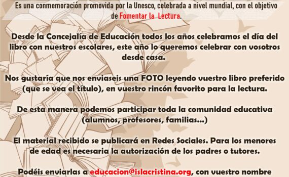 Desde la Concejalía de Educación seha organizado una actividad destinada atoda la Comunidad […] Anuncios Cultura Educación EL AYUNTAMIENTO DE ISLA CRISTINA CONVOCA LA CELEBRACIÓN DEL DÍA ESCOLAR DEL LIBRO