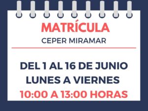 Educación PLAZO MATRICULACIÓN DE EDUCACIÓN DE ADULTOS Publicada 29 mayo, 2020 Del 1 al 16 de junio queda abierto el plazo de matriculación de Educación de Adultos, infórmate en el CEPER Miramar.