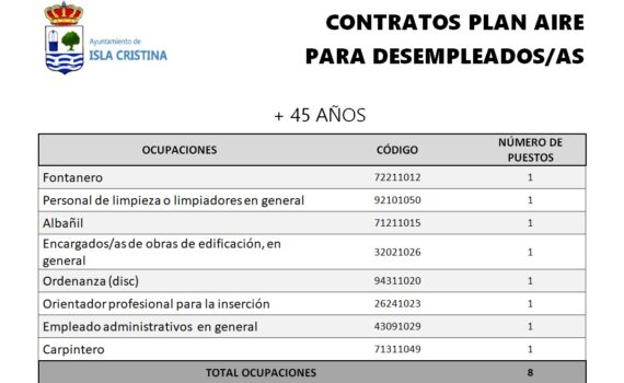 Isla Cristina, 8 de septiembre de2020.- El Ayuntamiento de Isla Cristina hapuesto en marcha […] Anuncios EL AYUNTAMIENTO PONE EN MARCHA LA INICIATIVA AIRE QUE DESTINARÁ MÁS DE 340.000 EUROS A LA CREACIÓN DE TREINTA Y SEIS PUESTOS DE TRABAJO TEMPORALES EN EL MUNICIPIO