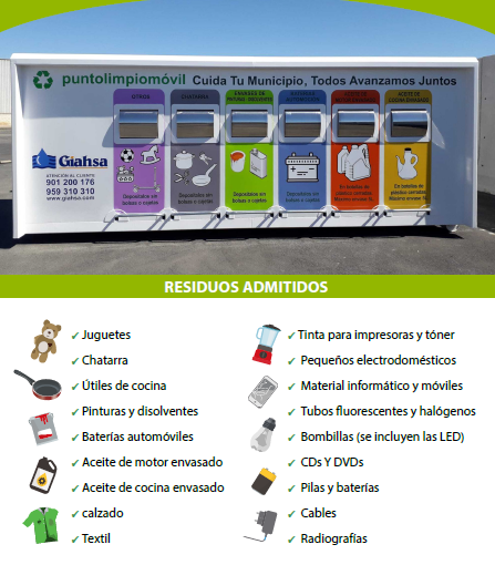 Publicada 14 julio, 2023 PUNTO LIMPIO MÓVIL GIAHSA – PUNTA DEL CAIMÁN (19- 26 JULIO) Puntos limpios moviles (tipos residuos)