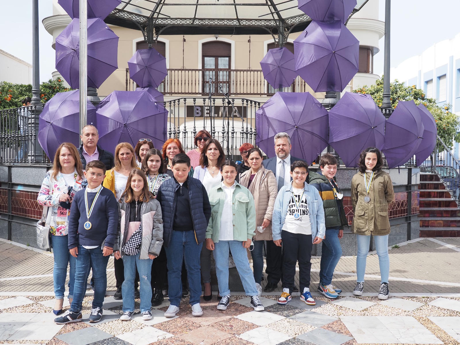 Así, con la participación de colectivos y asociaciones de diversa índole y las niñas y niños del Consejo de Infancia y Adolescencia, el CLIA; la jornada comenzó con la colocación simbólica de los paraguas violetas, adornando el kiosco de la música situado en la plaza y la lectura, primero de un manifiesto en la voz de los pequeños, y, segundo, del Manifiesto del 8M elaborado por la Federación Andaluza de Municipios y Provincias, al que puso voz la concejala delegada de igualdad, Ana Vieira a quien acompañaron varios ediles del Equipo de Gobierno y las técnicas del CIM.