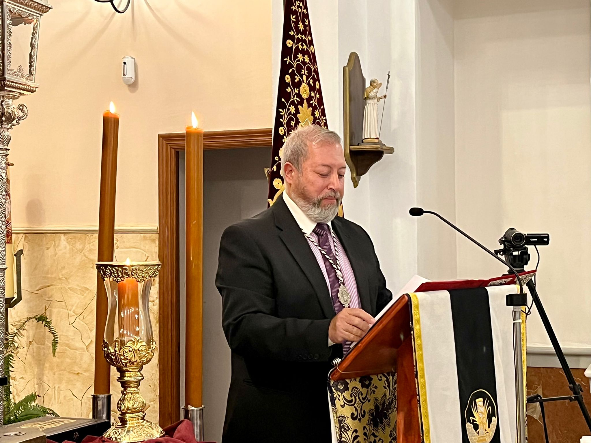 En representación del Ayuntamiento asistió el alcalde, Jenaro Orta junto a la Hermana Mayor de la Hermandad, Bella Vicente y los miembros de la Junta de Gobierno así como representantes del Consejo de Hermandades y Cofradías, Hermanos Mayores de la Hermandades de Penitencia isleñas, cofrades, amigos y familiares del pregonero que fue presentado por Manuel Carrasco, hijo de Manuel Carrasco Fragoso -Manolito de los Santos-, fundador de la Hermandad.