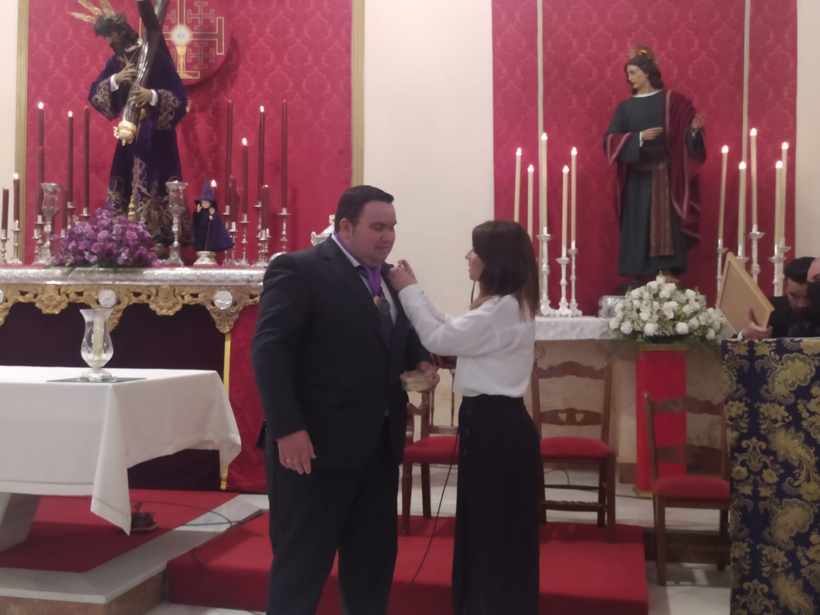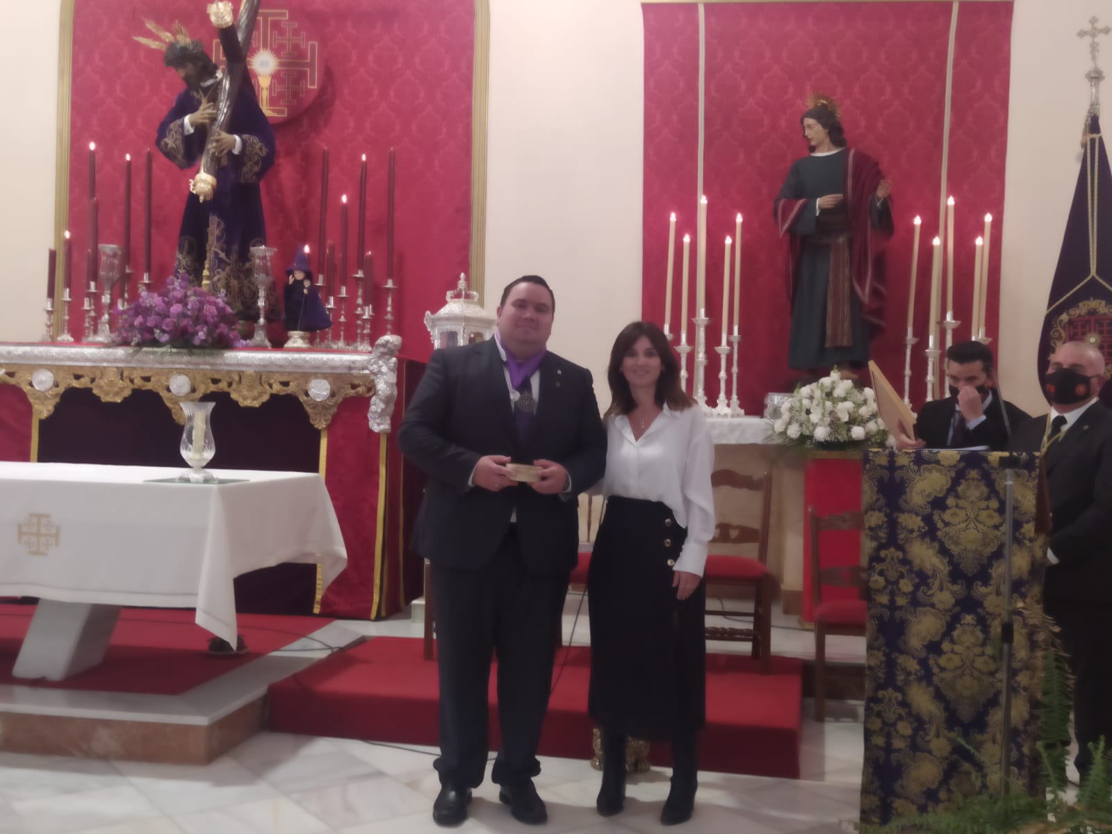 Una vez finalizada la declamación, Francisco Jesús Soto recibió las felicitaciones de todos y distintos obsequios en agradecimiento a su Pregón que les fueron entregados por Manuel Enrique Biedma, Hermano Mayor de la Hermandad.