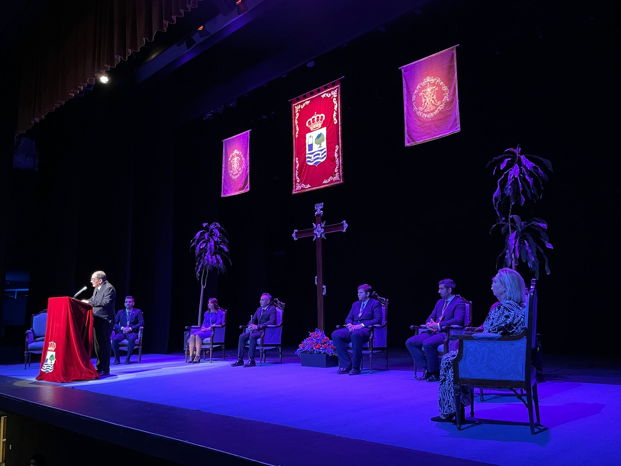 El solemne acto comenzaba tras la interpretación de la marcha ‘Amarguras’ por parte de la Banda de Música isleña dirigida por Isaac Anastasio Romero, con las palabras del pregonero del 2019, Manuel López González, quien además de dar las gracias por las muestras de agradecimiento y cariño recibidas cuando realizó su pregón, dedicó unas bonitas palabras a su predecesor que esperaba paciente su turno que llegó tras la segunda de las marchas, ‘Rocío.’