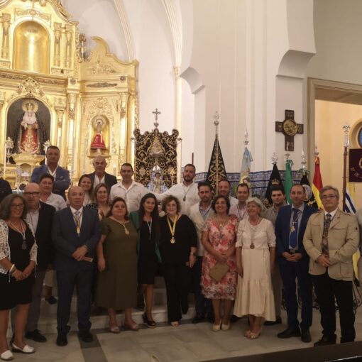 En representación del Ayuntamiento y sobre el escenario, el alcalde de la localidad, Jenaro Orta y la concejala delegada de Cultura, Ana Vieira junto los miembros del Consejo de Hermandades y Cofradías, concretamente su Secretario, Sebastián López, el vicesecretario, Manuel Quintero y la Vocal de Culto, Chari Hernández y la Pilar Quesada, vocal de Caridad