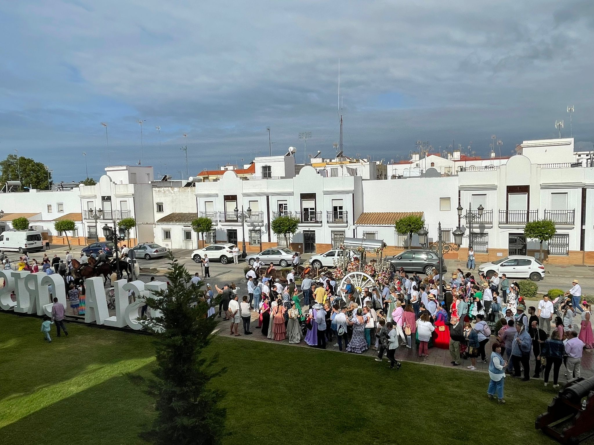 La comitiva isleña, de algo más de dos kilómetros y medio, la conforman veinte caballistas, veintidós carros de tracción mecánica y doce vehículos de tracción animal ocupados por los algo más de seiscientos romeros que llegarán el jueves hasta la aldea de El Rocío.