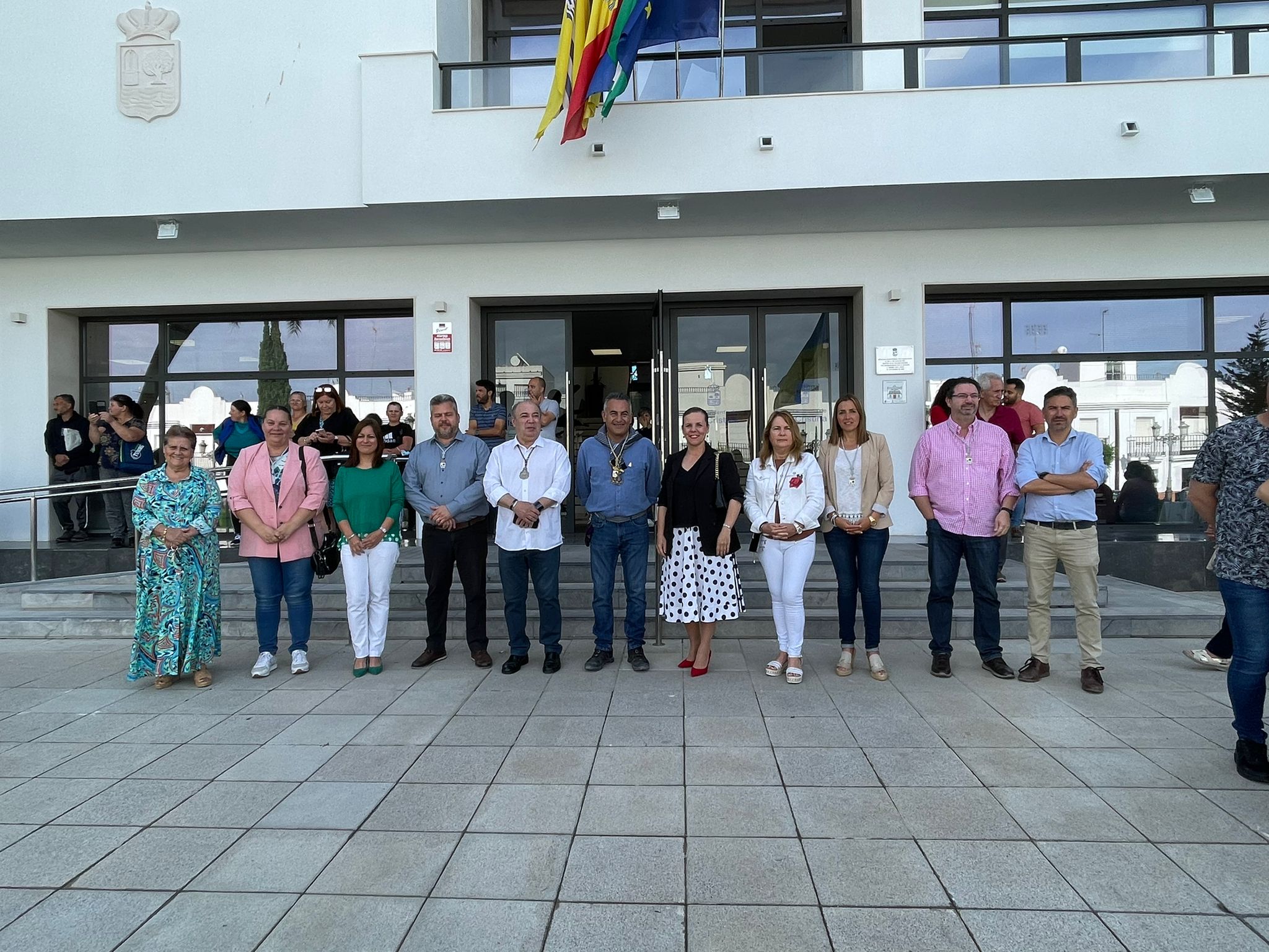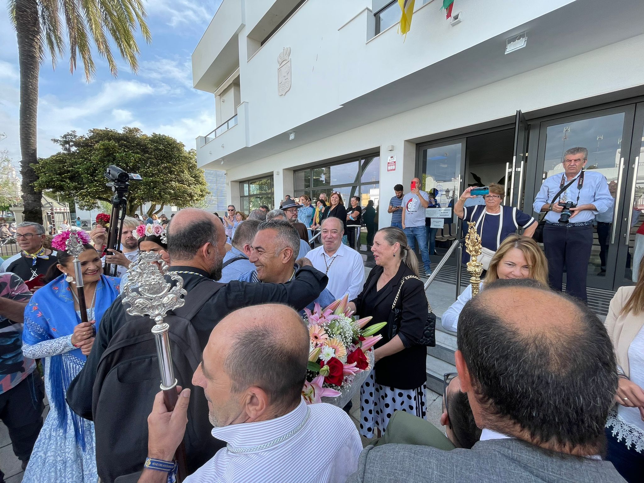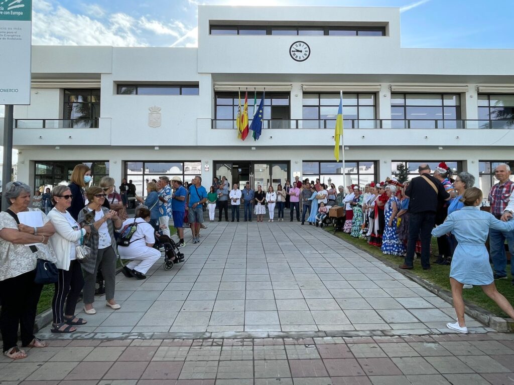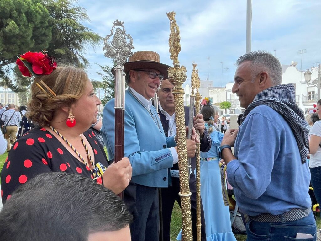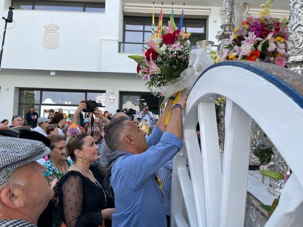 A las puertas del Ayuntamiento esperaba una amplia representación de la Corporación, encabezada por el alcalde, Jenaro Orta, que recibían emocionados al Simpecado y a todos los peregrinos que lo acompañaban. Mientras sonaban las sevillanas interpretadas por el Coro del centro de participación Activa de Mayores, ‘Marisma y Rocío’, el alcalde y su socios de Gobierno hacían entrega de un ramo de flores al presidente de la Hermandad, Pedro Álvarez, para que lo colocaran en la Carreta del Simpecado mientras los despedían y les deseaban ‘un buen camino.’