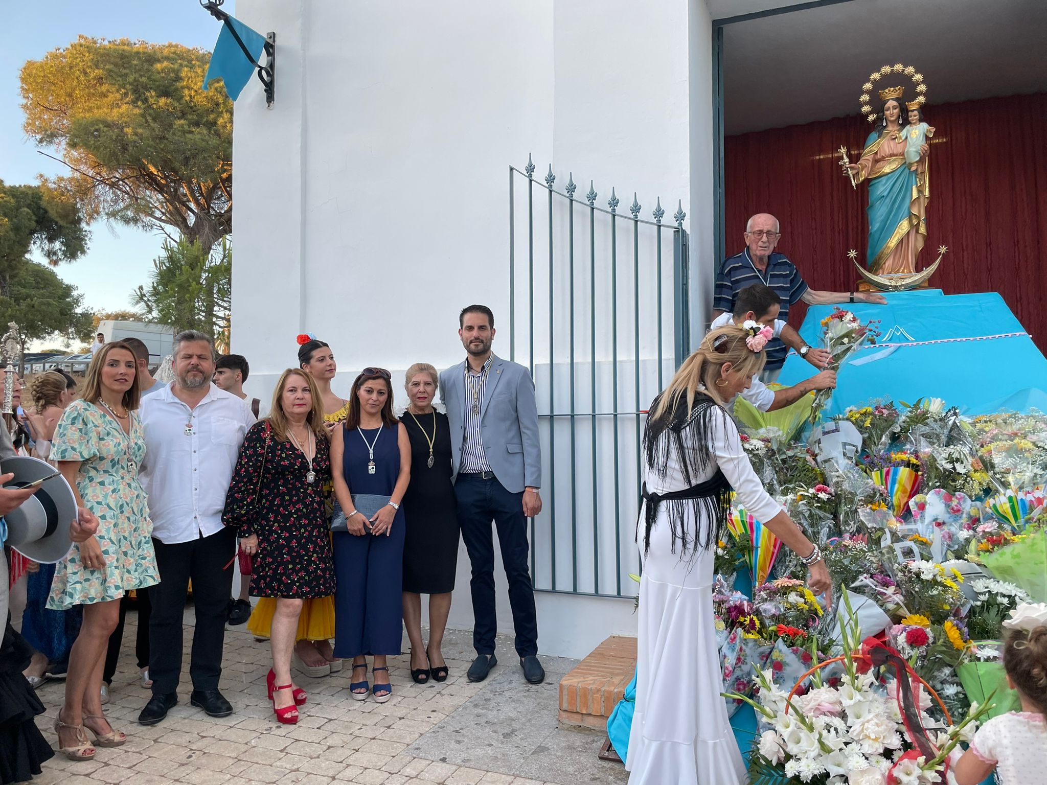 Todos juntos, junto al resto de personas que se sumaron a esta Ofrenda, se dirigieron al pórtico de la Parroquia donde esperaba la imagen de la Virgen sobre un altar y en cuya base se fueron depositando los diferentes ramos y canastos de flores.