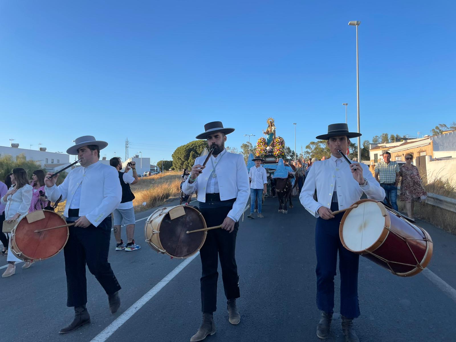 Como ya es tradición, la Patrona de Pozo del Camino recorrió las calles de su barriada, engalanadas para la ocasión, en una carreta tirada por bueyes y acompañada además por la Escuela de Tamborileros de María Auxiliadora.
