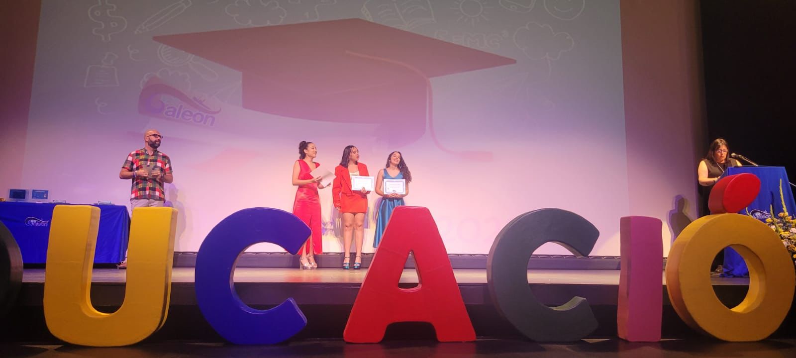 Tampoco faltaron los vídeos de presentación de cada curso tras lo cual los profesores profesoras del centro impusieron las bandas y entregaron los diplomas a los alumnos graduados. También se entregaron las distinciones como la Matrícula de Honor, a la alumna Nuria Fernández y a Sofía Jiménez y Claudia Rodríguez como ‘Alumnos Excelentes.’