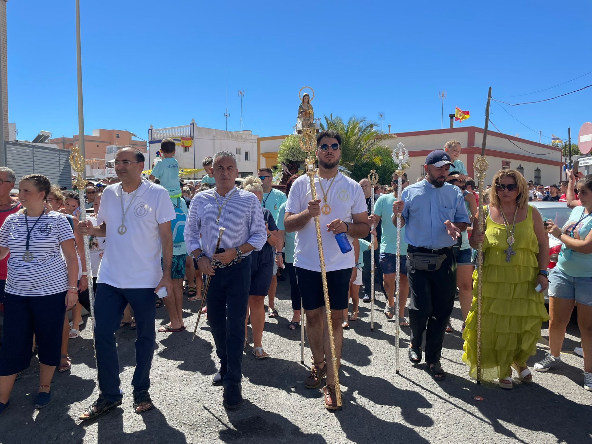 Tras un almuerzo rápido, la organización volvió a la calle para preparar el acto culmen de las fiestas, la Procesión de la Virgen que recorre todas y cada una de las calles de la barriada, bendiciendo cada vivienda y donde les esperan grupos de sevillanas, salves y de plegarias que, posteriormente, serán grabadas en un CD.