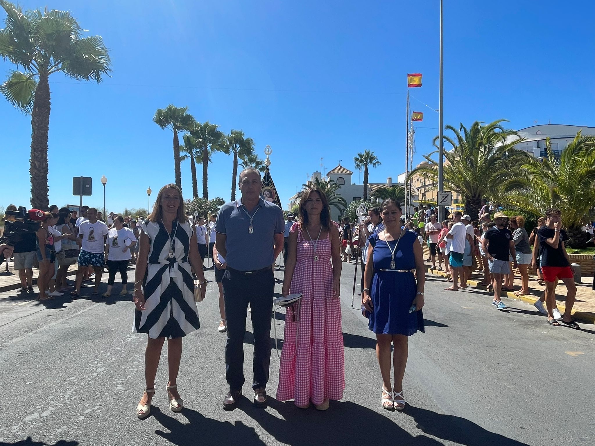 Así, y como manda la tradición, a las cuatro de la tarde y bajo un sol implacable, hacía su salida procesional la Virgen del Mar portada por mujeres costaleras de la barriada, entre las que se encontraba la presidenta de la asociación vecinal, María Casado Carrillo; y que, tras recorrer las avenidas principales, llegaron hasta el puerto donde embarcó en el pesquero «Martín Estévez» para bendecir las aguas.