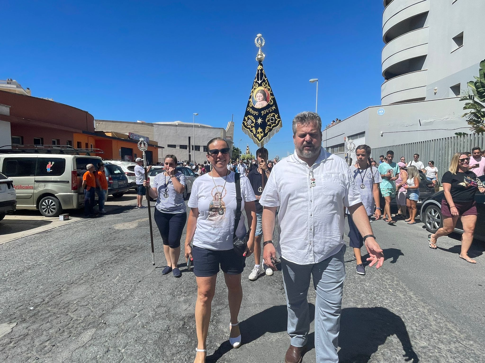 Acompañando a la imagen, toda la Junta de Gobierno de la Hermandad Sacramental, la Asociación de Vecinos y la UD Punta del Caimán, así como una amplia representación institucional encabezada por el alcalde, Jenaro Orta y la concejala delegada de Festejos, Mª del Carmen Beltrán. También formaban parte del cortejo los miembros del Consejo de Hermandades, representantes de otras Hermandades de Penitencia y Gloria de la localidad isleña, un cortejo al que esperaban cientos de personas, tanto isleños como de fuera de la localidad que no quisieron perderse este recorrido.