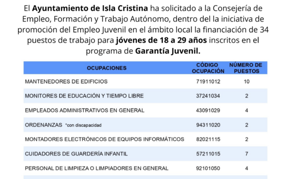 El Ayuntamiento de Isla Cristina desarrollaráel proyecto JOVEN AHORA ISLA CRISTINA,en el marco […] Anuncios EL AYUNTAMIENTO INFORMA SOBRE LA INICIATIVA PARA LA PROMOCIÓN DEL EMPLEO JUVENIL EN EL ÁMBITO LOCAL. PROGRAMA JOVEN AHORA