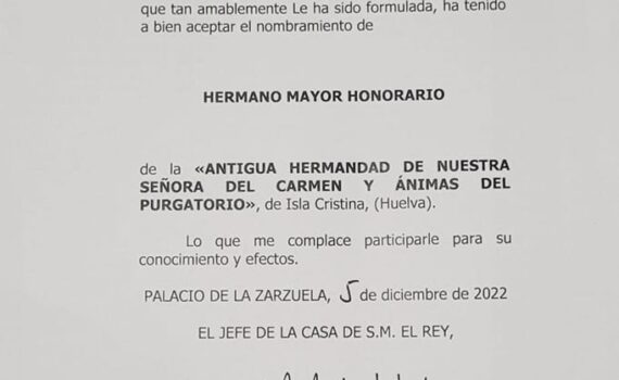 El alcalde de Isla Cristina, JenaroOrta ha querido expresar, en nombrede toda la […] Anuncios S.M. EL REY DON FELIPE VI, HERMANO MAYOR HONORARIO DE LA HERMANDAD DE NUESTRA SEÑORA DEL CARMEN DE ISLA CRISTINA