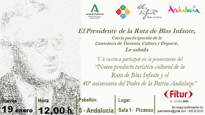 La Ruta de Blas Infante presentará en Fitur su nueva etapa, tras diez años de actividad turística y cultural. Será en la Sala Picasso, del Pabellón nº 5 de Andalucía, el jueves 19 de enero a las 12:00h, por cortesía de la Consejería de Turismo, Cultura y Deporte de la Junta de Andalucía y su Empresa Pública, Turismo Andaluz.