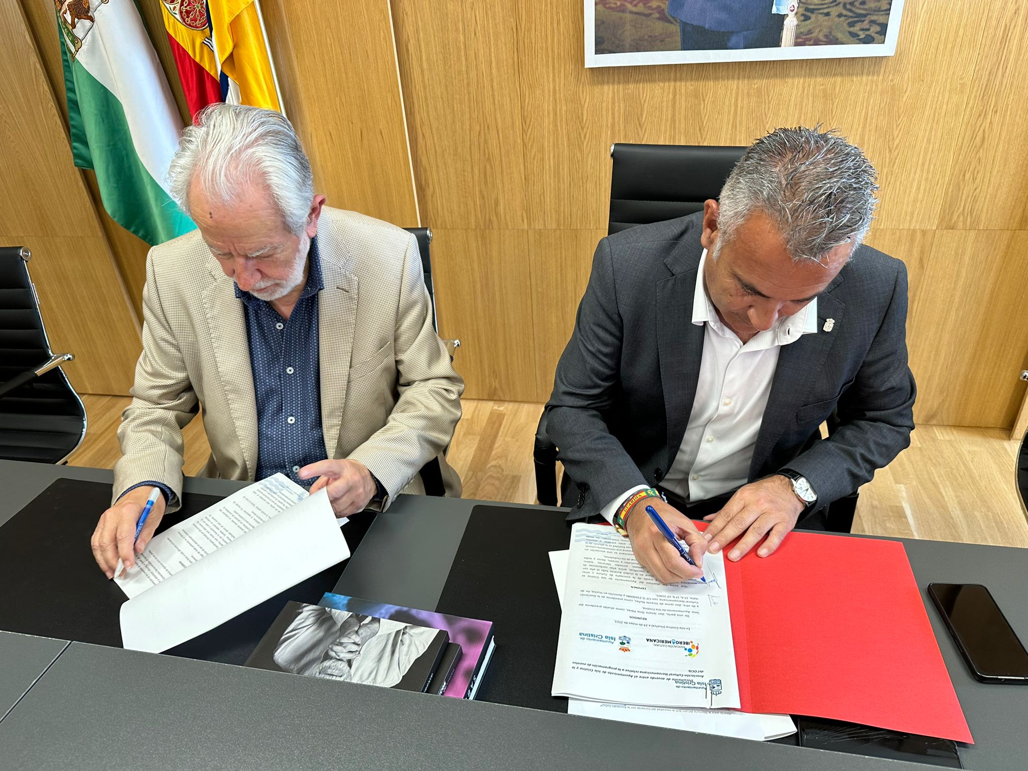 La rúbrica del documento tuvo lugar en el Salón de Plenos del Ayuntamiento por parte del alcalde, Jenaro Orta y el presidente de la Asociación Cultural Iberoamericana, Jaime de Vicente Núñez, en presencia de la concejala delegada de Cultura, Ana Vieira, el ex editor del periódico La Higuerita e impulsor de esta nueva colaboración, Rafael López Ortega y la secretaria de la misma, Loli Bosque.
