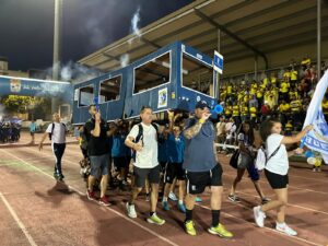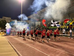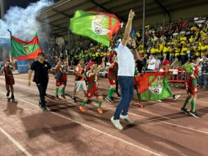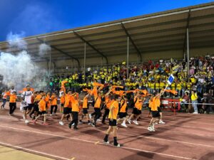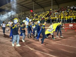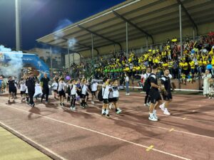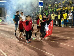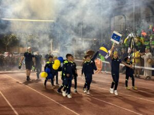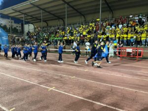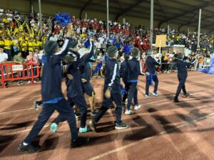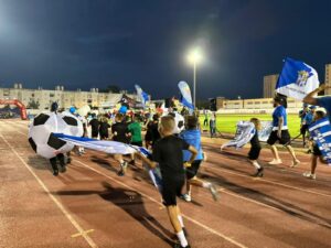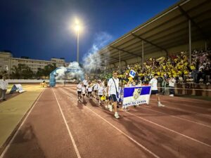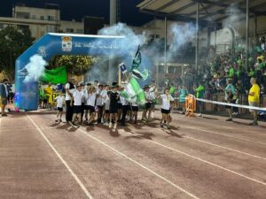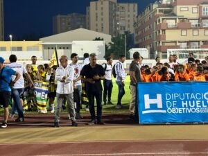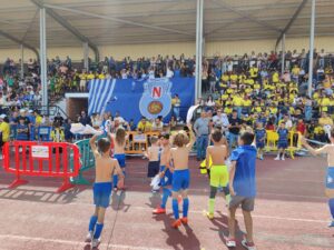 Los equipos partieron de la plaza del Ayuntamiento hasta el campo municipal en el que les esperaban las gradas llenas de familiares que pudieron disfrutar de la actuación del Grupo Jamakuko, formación isleña que amenizó la espera junto a Ernesto Algarra, speaker encargado de anunciar y presentar a los equipos.