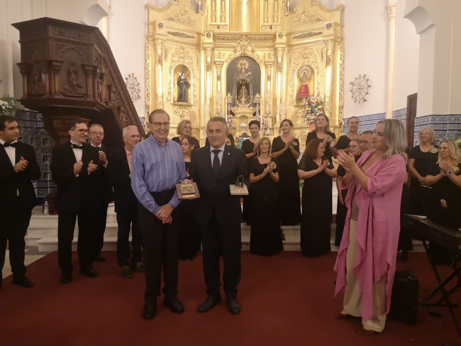 Destacar que ambas corales hicieron entrega de varios obsequios conmemorativos del momento tanto a la Coral Polifónica Isla Cristina como al Ayuntamiento de la localidad, el cual recogió el alcalde muy agradecido.