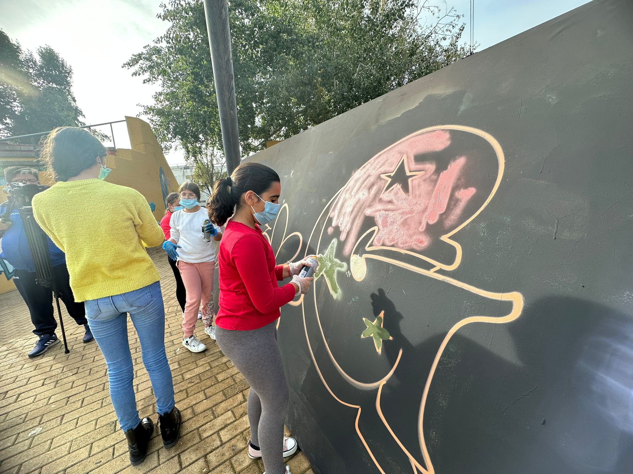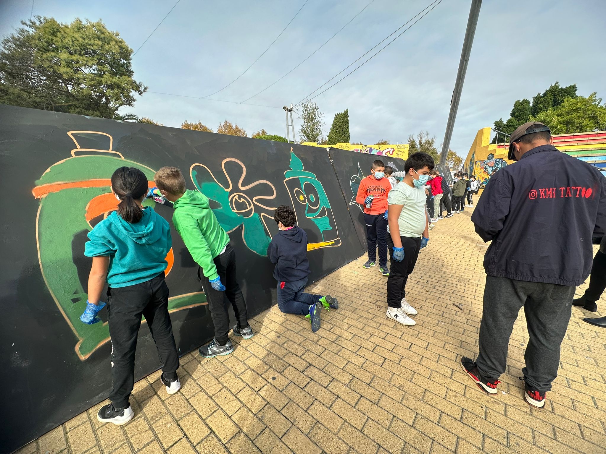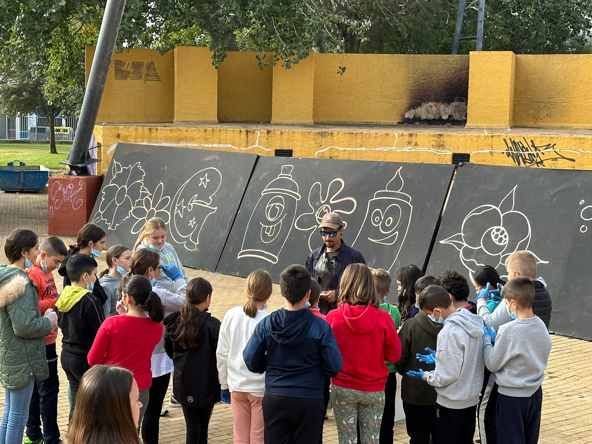Con el graffiti de fondo realizado a la entrada del Anfiteatro del Parque Central y en el que puede leerse la frase “Todas las Artes contribuyen a la Educación”, los escolares han disfrutado de las explicaciones de su autor y monitor del Taller en el que además ha podido adquirir habilidades artísticas y de expresión comunicativa que ha podido desarrollar y expresar.