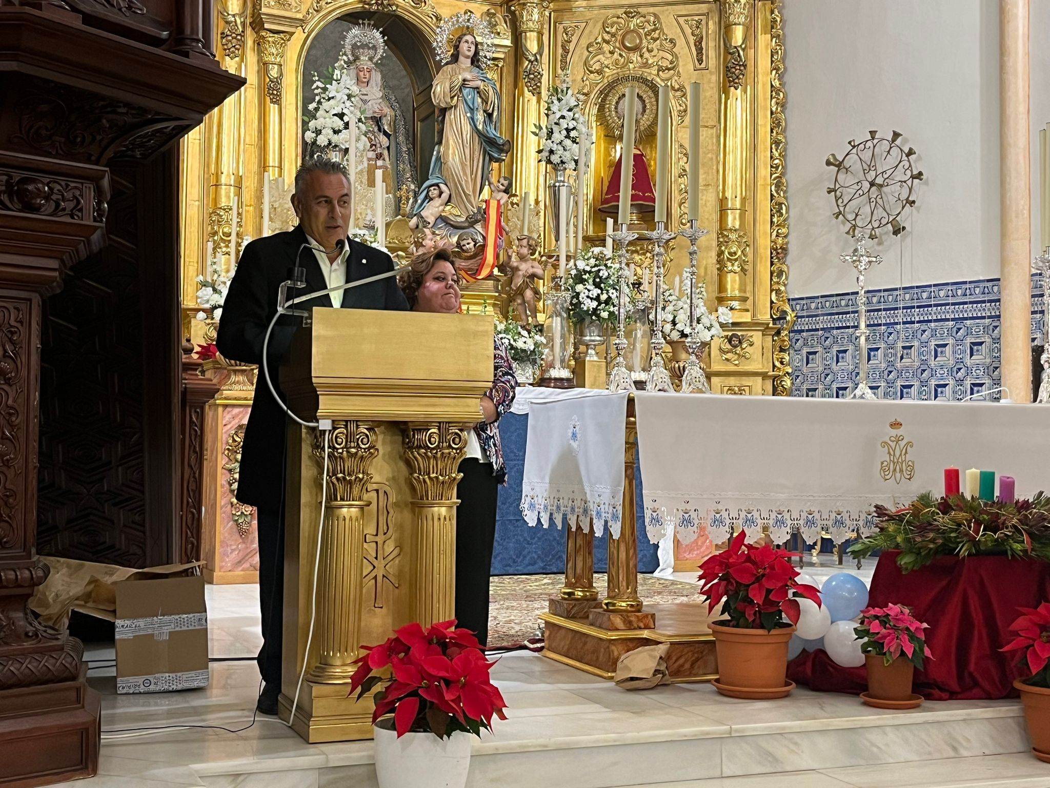 La presidenta de la Hermandad, por su parte, destacó «la belleza de esta obra y la calidad humana del autor, cuyas manos han estado guiadas por la Virgen cuando ha hecho el cartel y lo eligió para que él fuera el autor» dándole las gracias por, como dijo, «este regalo que nos ha hecho» haciéndole entrega de varios obsequios en agradecimiento por su colaboración en tan importante efemérides para la Hermandad isleña.