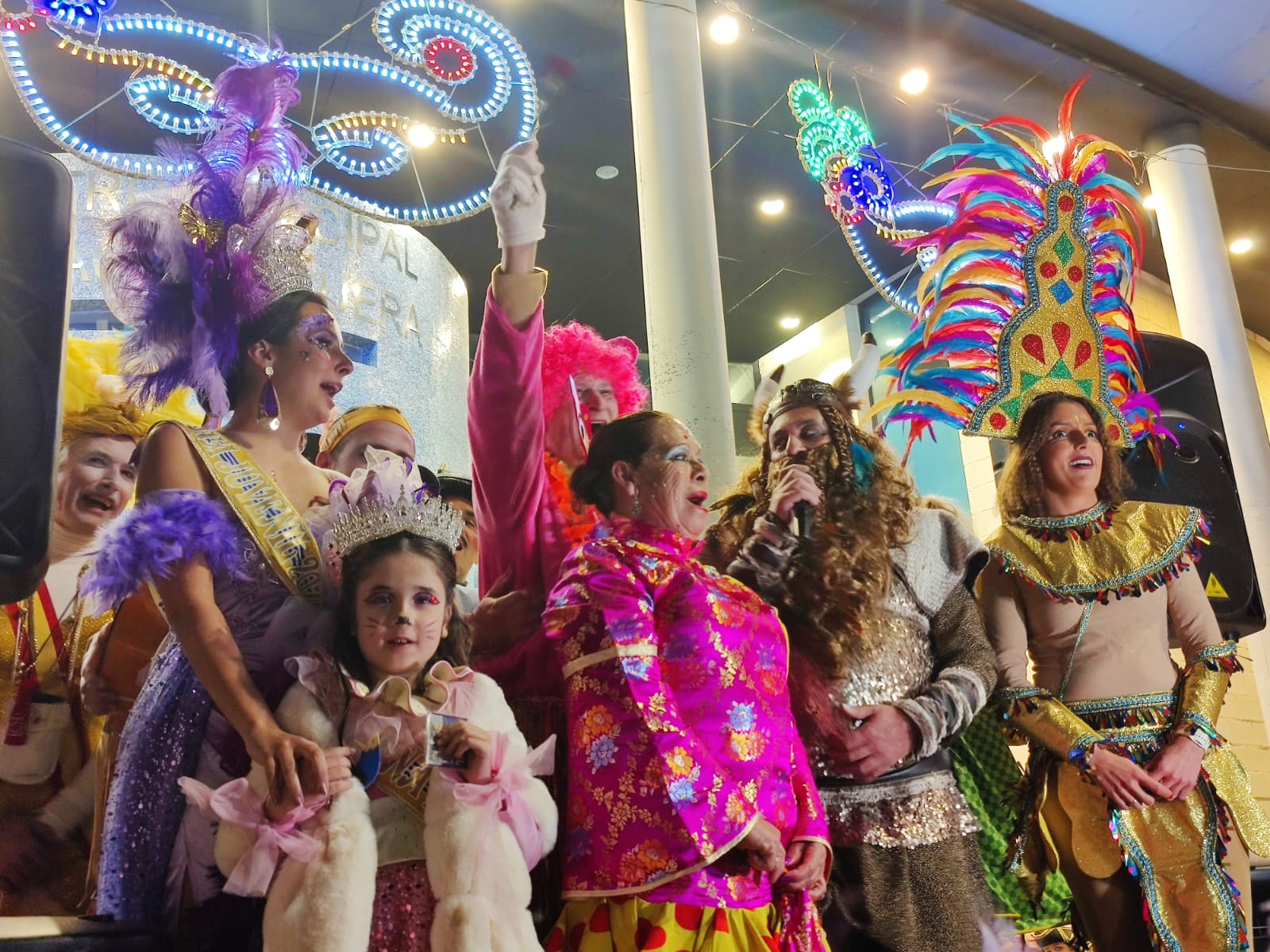 Subían pues al escenario el alcalde, Jenaro Orta, la concejala de Festejos, María del Carmen Beltrán junto Rafael Martínez Reiné, el Pito de Caña 2024, Custodio Soarez Luzía, las Reinas del Carnaval, y amigos y familiares, para saludar a toda la ciudadanía y poner en marcha la maquinaria para que las máscaras comenzarán a tomar las calles.