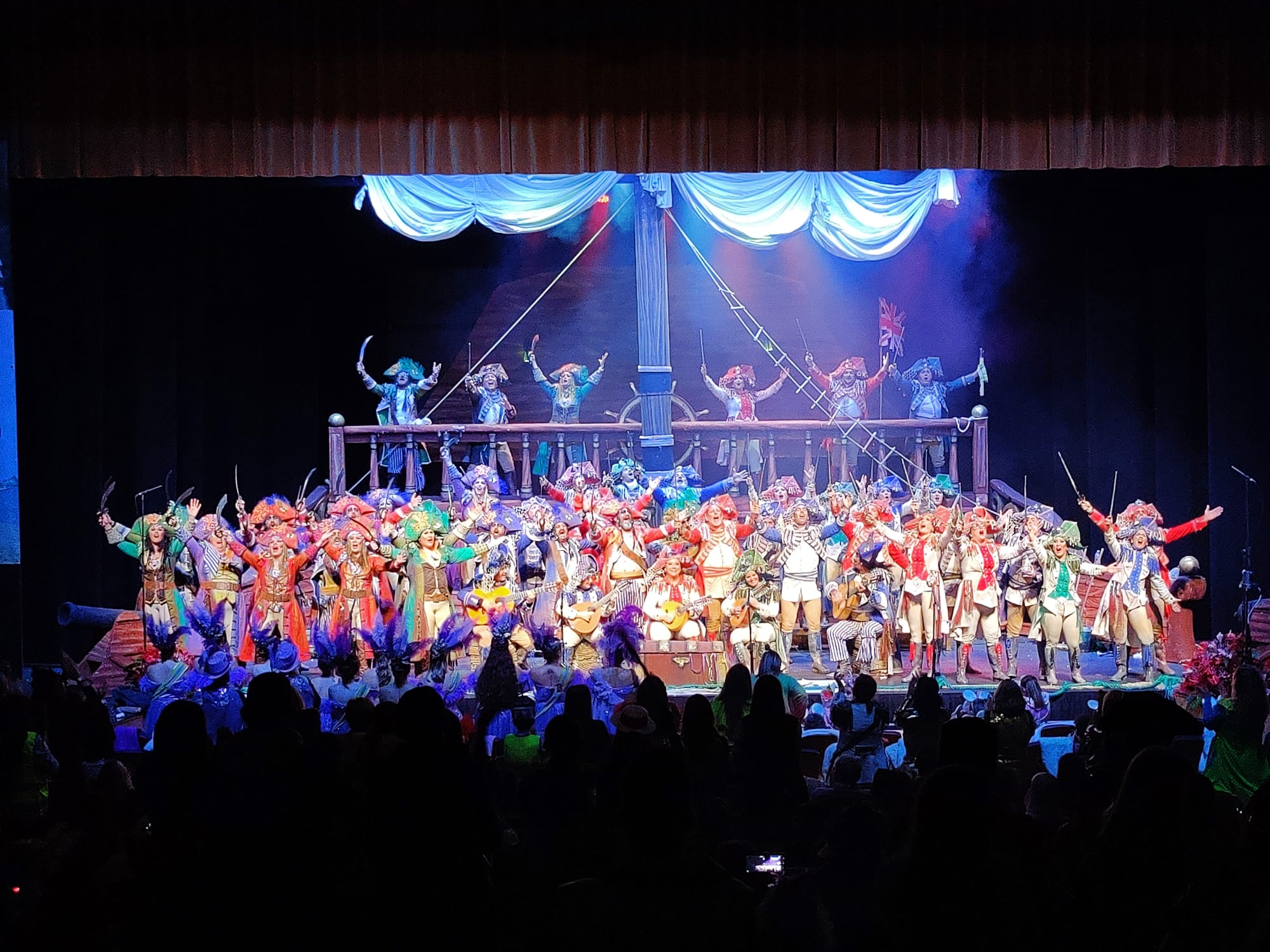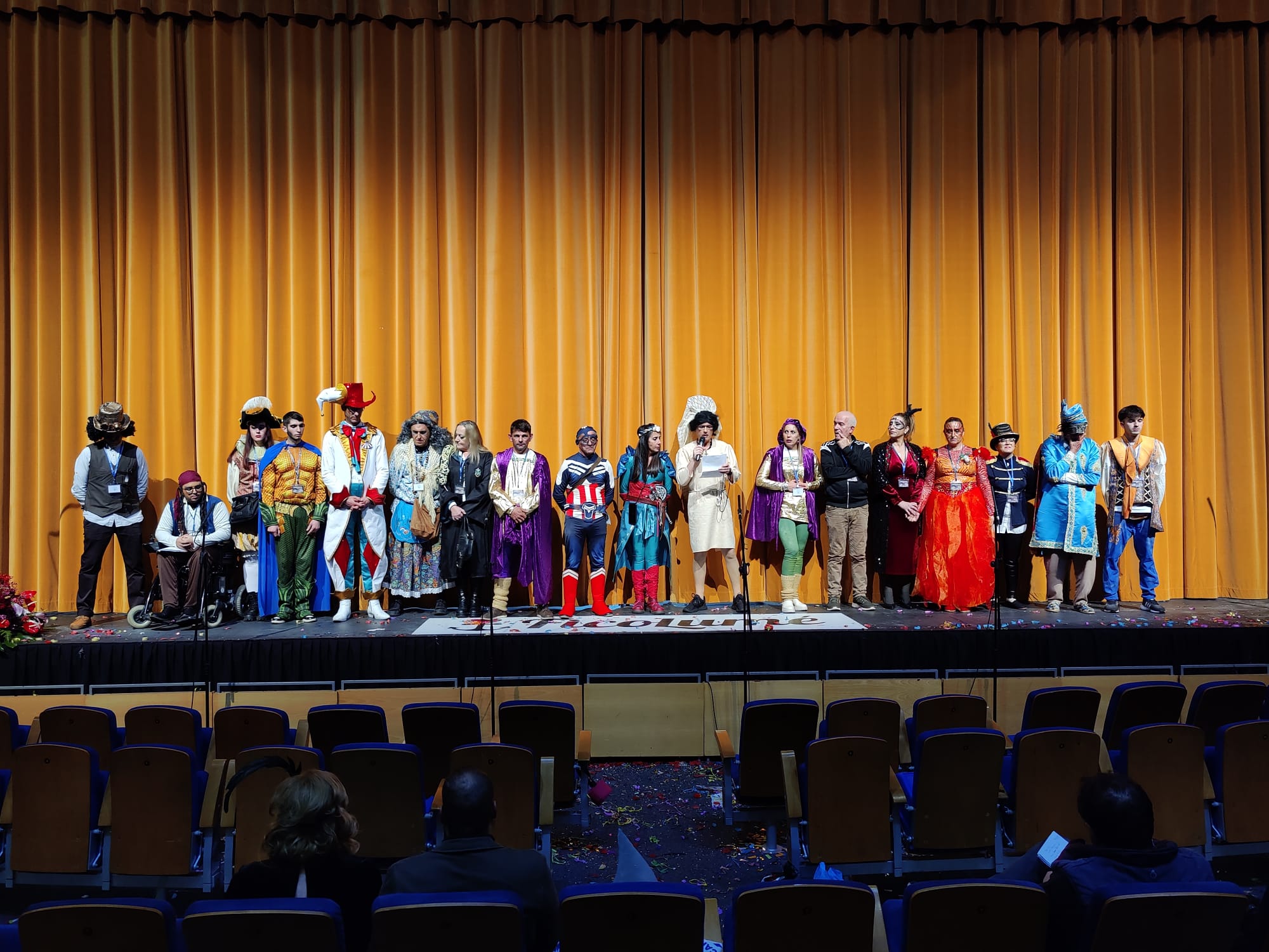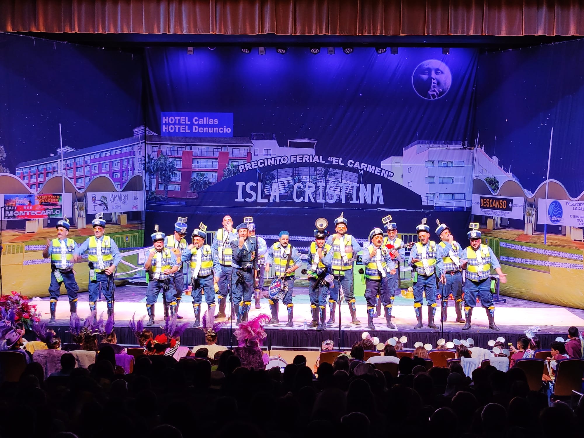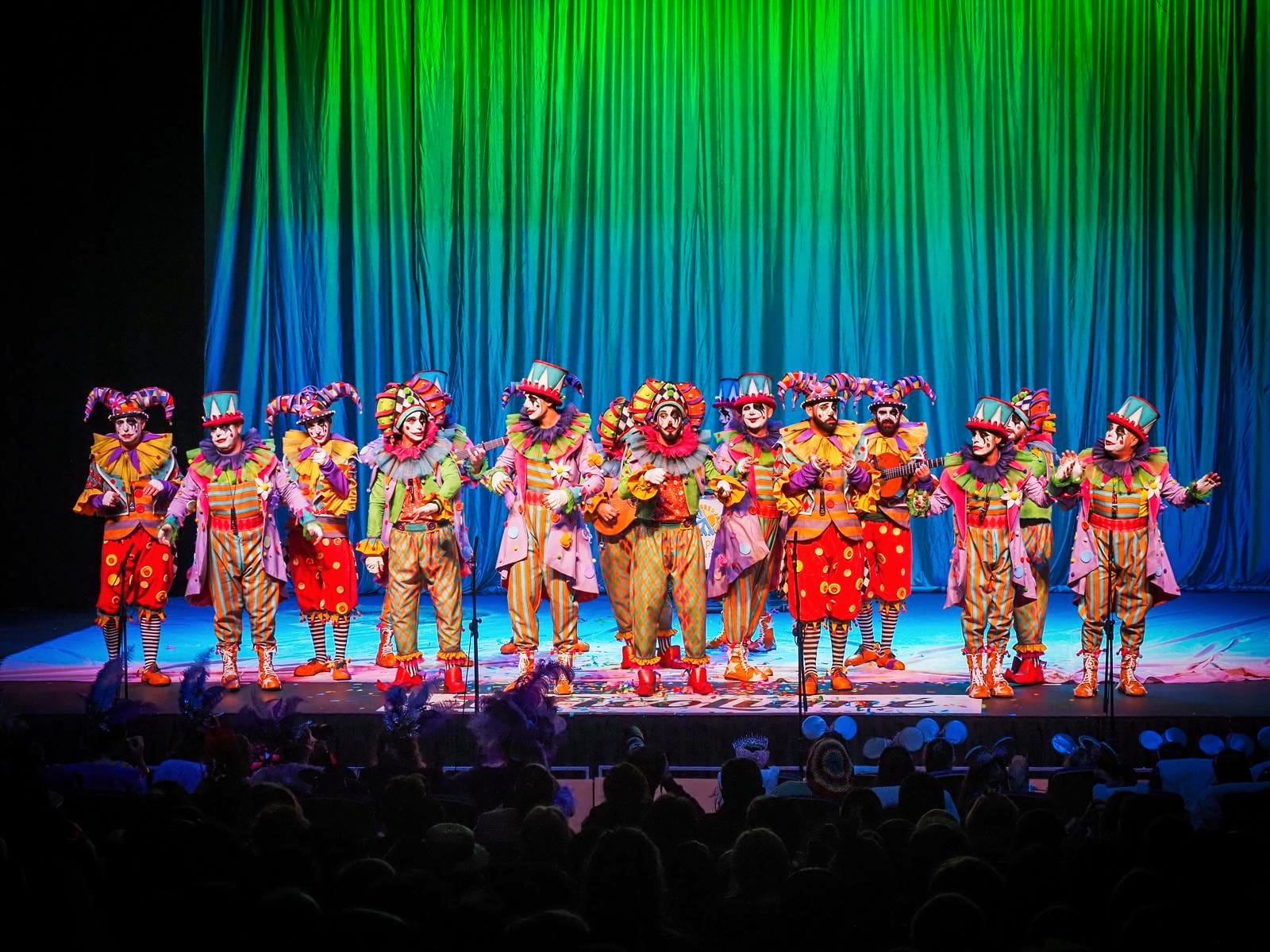 Diez agrupaciones competían por el primer puesto en una noche en la que el público, tanto el asistente que llenaba el teatro disfrazado para la ocasión a esta esperada jornada, como aquellas personas que lo seguían a través de los medios de comunicación y las Redes Sociales, disfrutaba de todas las actuaciones y lo que ocurría en el escenario.